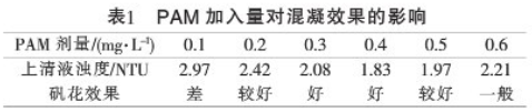 由前一輪試驗(yàn)確定以PAC作為混凝劑,投加量為15~20mg/L,根據(jù)經(jīng)驗(yàn)和試驗(yàn)數(shù)據(jù)比較后選定PAC投加量為15mg/L,在水樣溫度為28℃水樣濁度為584NTU情況下,改變PAM投加量觀察不同劑量PAM的混凝效果結(jié)果見(jiàn)表1。