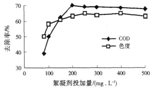 由圖3可知,當(dāng)絮凝劑聚合氯化鋁鐵投加量為200mg/L時(shí),COD去除率為70%,色度去除率為63%,即絮凝后出水COD為69mg/L,色度為44倍,出水水質(zhì)達(dá)到《污水綜合排放標(biāo)準(zhǔn)》(GB8978-1996)中的一級(jí)排放標(biāo)準(zhǔn)。