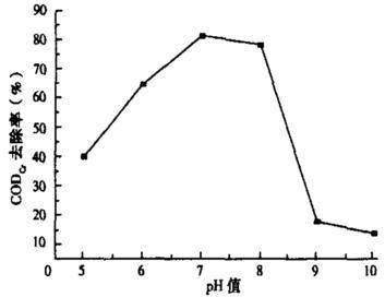 在保持絮凝劑PAC和助凝劑PAM用量不變的情況下,按照實(shí)驗(yàn)方法用苛性鈉溶液或稀硫酸調(diào)節(jié)pH值,觀察pH值對(duì)CODCr去除率的影響,實(shí)驗(yàn)結(jié)果見(jiàn)圖。