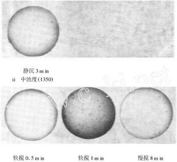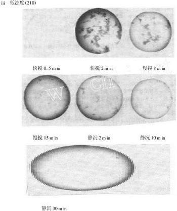 由于不同濁度水中膠體粒子濃度不同,這種明顯區(qū)別在顯微照片上看得很清楚,尤其在快攪、慢攪階段,濁度高的水體礬花數(shù)目多。